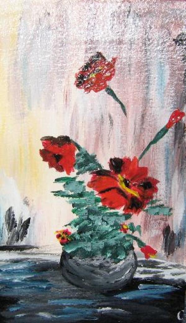 The painting presents a bouquet of red poppies. Size:30X24. Medium: Acrilic
