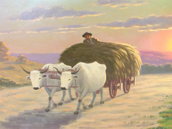 Vind tablou ulei pe pinza, reproducere de calitate la dimensiuni 780/520, dupa Nicolae Grigorescu – Caru’ cu Boi. Taboul este semnat de pictor consacrat I. Culmaciuc