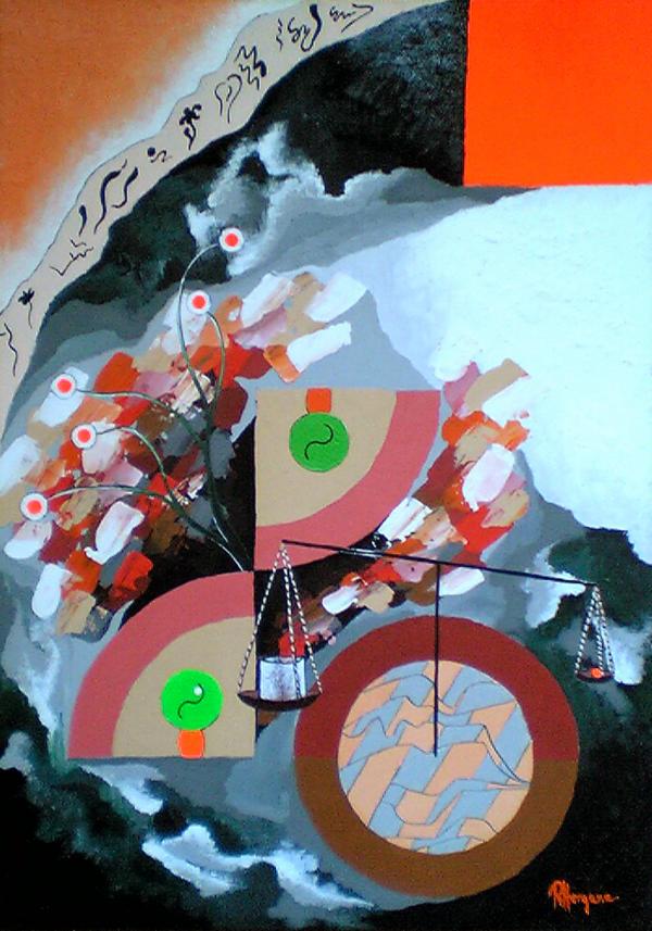 Toamna luminata. Frunzele aramii si fereastra oranj, reprezinta toamna luminata. O toamna calda, cu mult soare, si o renastere a sperantelor. Balanta, paradoxal inclinata invers, reprezinta triumful calitatii impotriva cantitatii, reprezentata de un vas de sticla, mare, dar gol. Cele doua vaze cu flori, simbolul perfectiunii: una, avand culori vibrante si luminoase, si o floare alba, reprezinta omul acceptat, fericit, care merge cu succes inainte... iar cea avand culori stinse, reprezinta omul respins, fara prezent si fara viitor