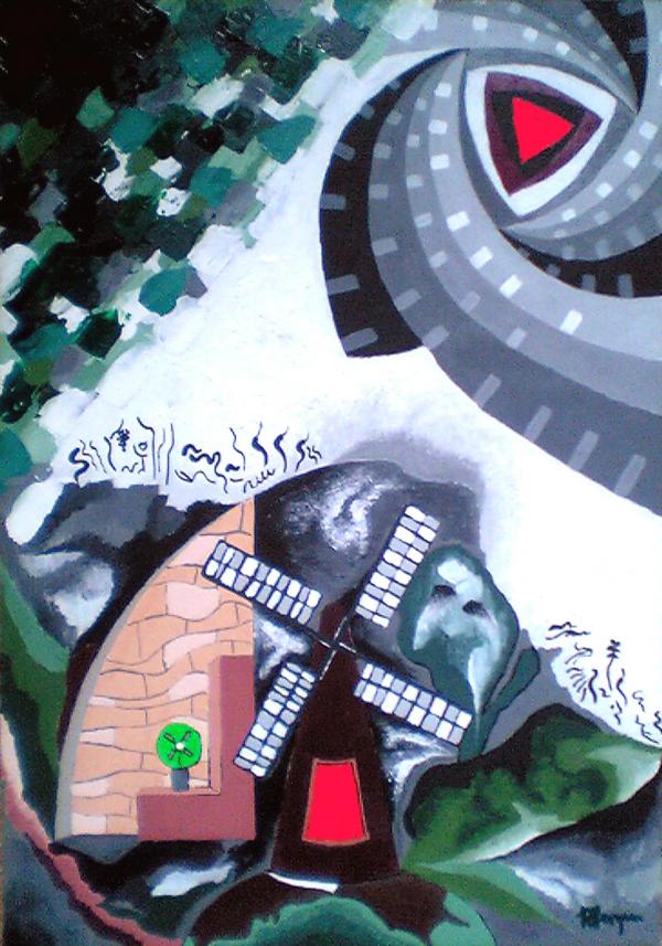 Moara universala. Sus, un centru de galaxie care absoarbe tot. Verdele intens reprezinta speranta, vara, caldura naturala. Moara de vant, intr-o miscare sugerata,o pozitie instabila a palelor indica activitate intensa, viata. In interiorul morii, rosul incins, ca din cuptor este extras din globul terestru de la baza imaginii... se vede asia si america, un pamant plin de risipe, cu resursele-ii murind in consumul nebun