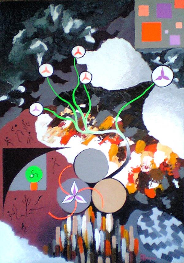 Imbinare intre culorile intunecate si griurile reci, versus oranjuri reprezinta trecerea de la toamna luminata la o iarna blanda. Omuletii interpretabili se joaca, se misca, se observa prima bruma si ninsoare, in patratul de sus contrastul intre violet si oranj - toamna-iarna totusi sunt calde amandoua. Planta arata un viitor nou, iar cifra 3, de 3 ori amplificata in figura centrala, reprezinta trinitatea si echilibrul universal.