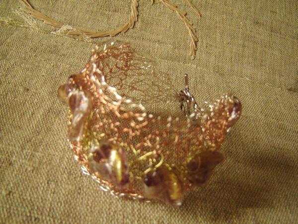 o bratara din sarma in trei culori: cupru, alama si cupru suflat cu argint... aramiu, auriu si argintiu cu margele murano cu foita de cupru, argint si aur in interior