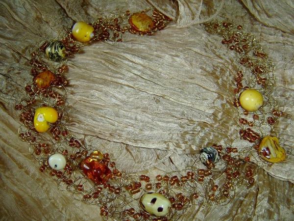 Material: margele Murano de diferite forme, dimensiuni si culori, sarma foarte fina aurita, elemente de legatura aurite