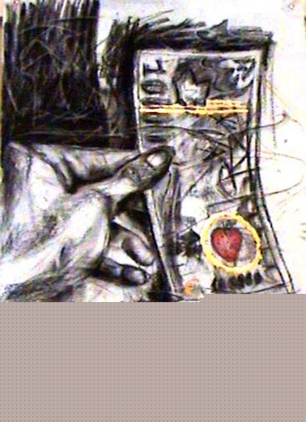 DESEN PE HARTIE CU CARBUNELE ,FOITA DE AUR SI CREION COLORAT