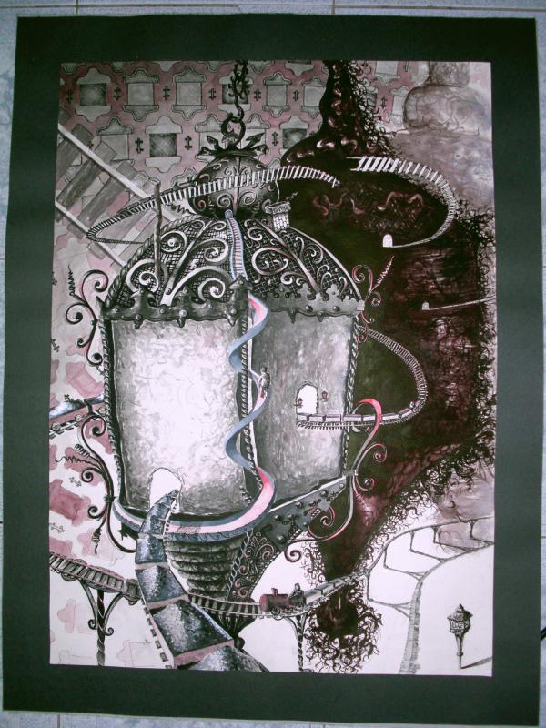 Compozitie simbolica.. tehnica tuşe , marime 80/60cm lucrare aformata , rama , sticla... Tema - Lumina , motive - Felinar ...Pret actual : 300 €
