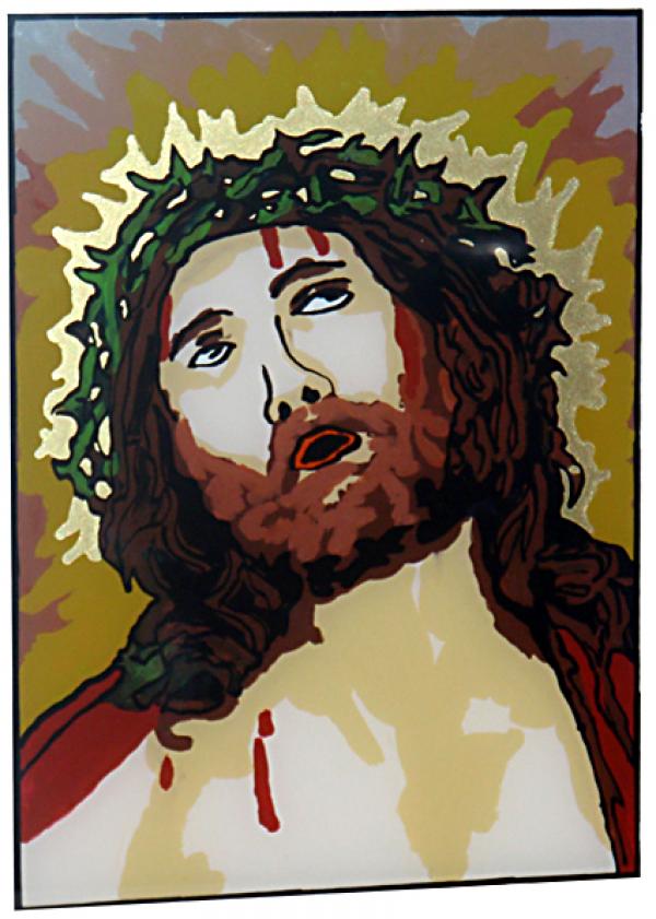 pictura pe sticla, pe reversul sticlei, culori acrilice, dimensiuni 18x25.5 cm