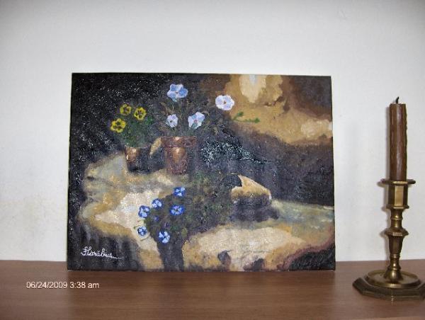 Pictura in ulei pe panza (o lucrare deosebita), titlul tabloului: Mireasma cu panselute, semnat S. Carabus. dimensiune 30 x 40 cm, executata pe sasiu cu panza profesionala import Italia (gr. sasiu 2 cm), lucrat in vopsele rusesti. Necesita inramare !! , pentru intrebari va astept aici sau la telefon 0764503307 multumesc !!