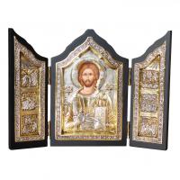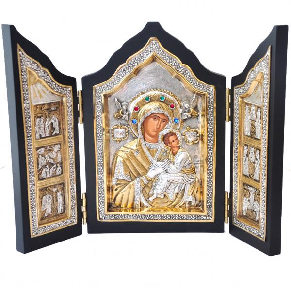 Triptic - Copie fidela dupa icoane Bizantine din secolul XIV, piesa este executate in Grecia, cu respect pentru traditie si calitate. Icoana este partial pictata manual, lucrata in argint 925 pe suport din lemn si partial aurita cu Au. 24Kt.