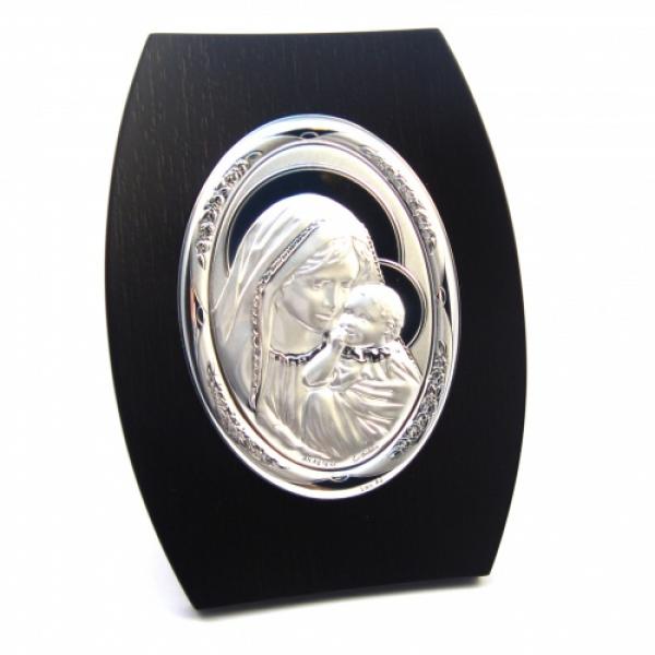 Icoana argintata pe lemn wenge, reprezentand Fecioara Maria cu Pruncul.