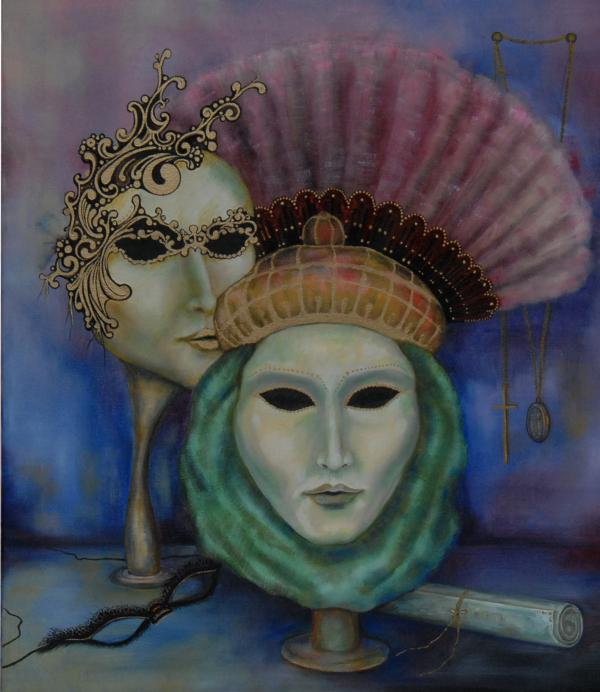 50X60;ulei/panza. Subiect: masca, mereu acolo, facand parte din noi.