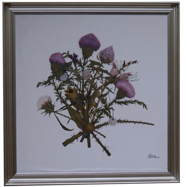 60X60;ulei/panza. Subiect: superbele cenusarese, florile de scaiete(Cirsium lanceolatum). Lucrare inramata.Pret actual : 800 €