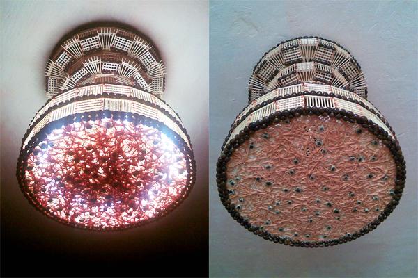 Candelabru lucrat din bete de chibrite,scobitori,boabe de cafea si alte materiale.Dimensiuni:35/50 cm
