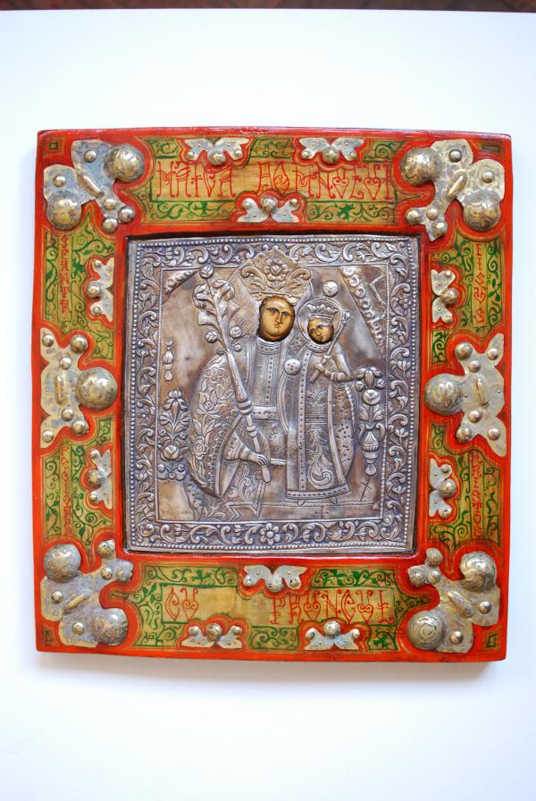 Bronz argintat pe lemn pictat, ferecaturi metalice