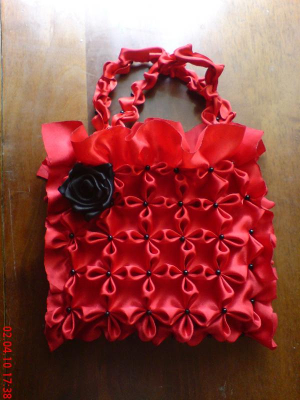 Poseta pentru ocazii deosebite, satin rosu decorat cu perle negre si un trandafir din satin negru de 6,5 cm, avand volanase in partea de sus si pe laterale, dimensiuni 24x24 cm, doua manere cu lungimea de 30 cm din acelasi material, satin rosu decorat cu perle negre. Diponibile: nelimitat, in functie de comanda. Culori existente: rosu, verde, alb. La comanda se pot alege si alte culori.