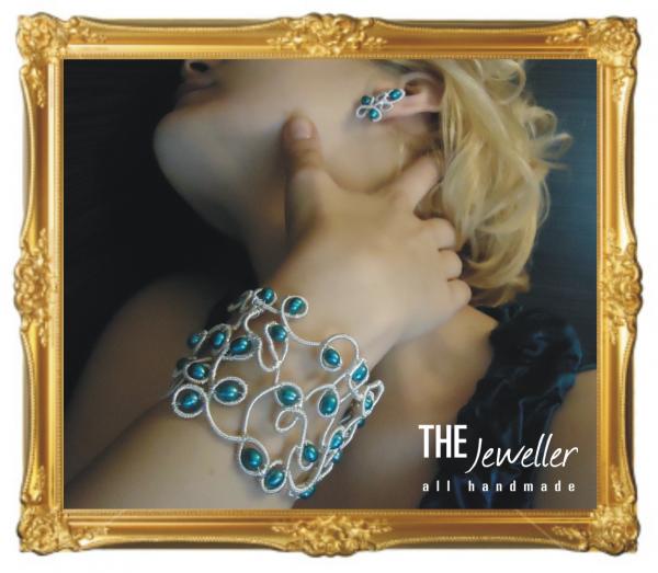 Setul PEARLY BLUE LACE este format din brăţară şi cercei cu design dantelat, confecţionate pe cadru de sârmă placată cu argint, pe care s-a răsucit sârmă foarte fină, de asemenea, placată cu argint, pentru a crea aspectul dantelat. Compoziţia brăţarii este presărată cu 31 de perle de cultură albastre, iar cerceii conţin fiecare câte 3 perle naturale de aceeaşi culoare. Brăţara are un sistem de prindere la încheietura mainii, iar cerceii se prind pe şurub. PEARLY BLUE LACE este un set deosebit, putând completa cu succes o ţinută de seară spectaculoasă.