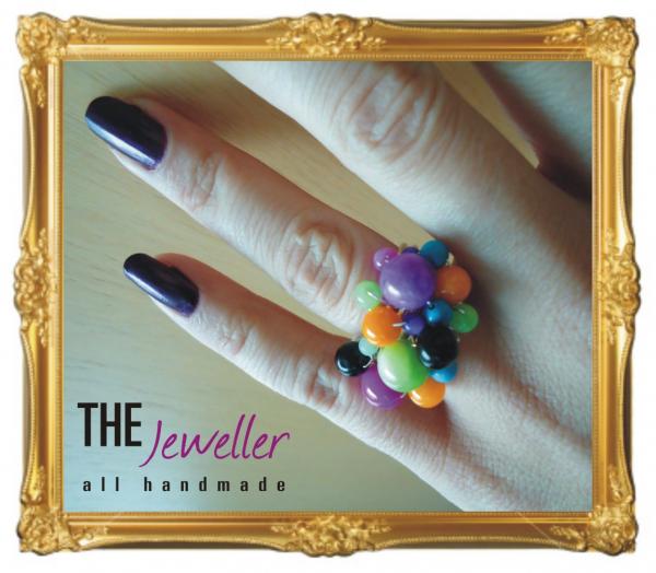 Inelul BUBBLES este realizat din sfere de sidef de diferite dimensiuni şi sfere de onix negru, toate “aglomerate” pe un cadru lat de sârmă placată cu argint. BUBBLES se poate asorta la orice ţinută veselă şi colorată de vară.