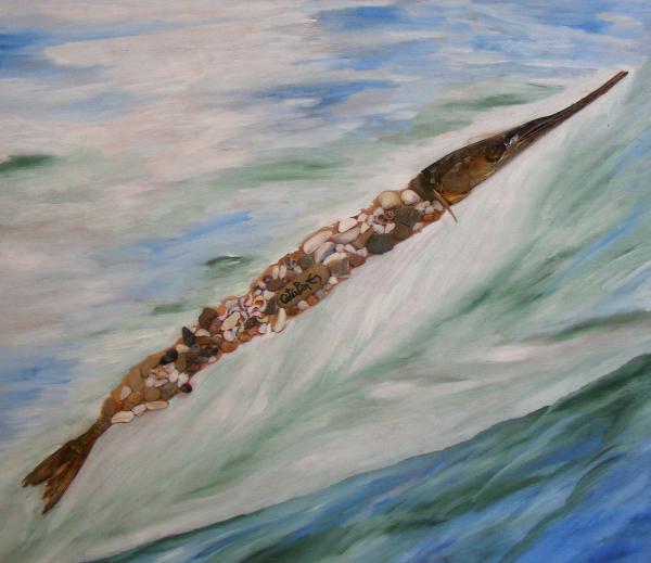 Pestele zburator (The Flying fish) Dimensiuni: 57,4 x49,5 cm – ulei pe pal cu pietre si bucati de peste mumificat)Pret actual : 300 €