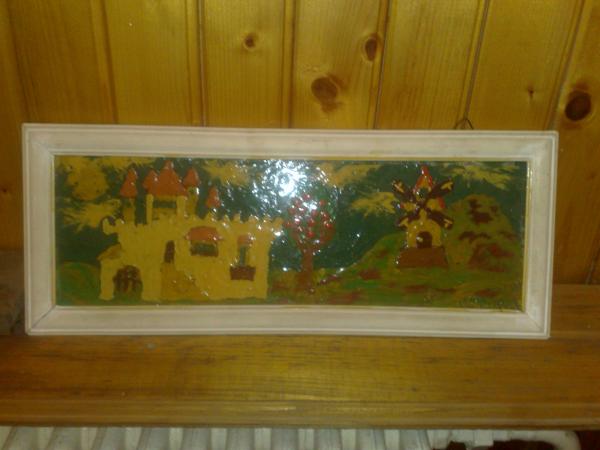 Desenata si pictata manual pe placaj de lemn cu ajutorul plastilinei incalzite la temperatura corpului .