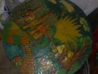 Desenata si pictat manual pe placaj de lemn cu ajutorul plastilinei incalzite la temperatura corpului .