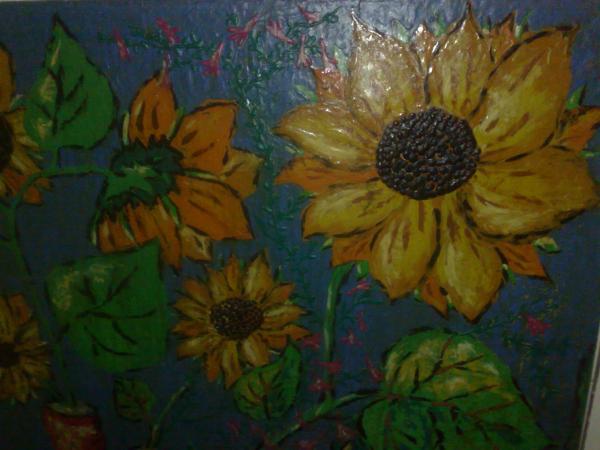 Desenata si pictata manual pe placaj de lemn cu ajutorul plastilinei incalzite la temperatura corpului .