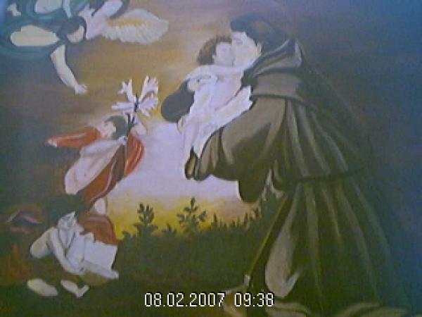 Pictura in ulei reprezentand scena din viata sfantului Anton de Padova, amomentul in care este surprins cu isus in brate,Pret actual : 60 €