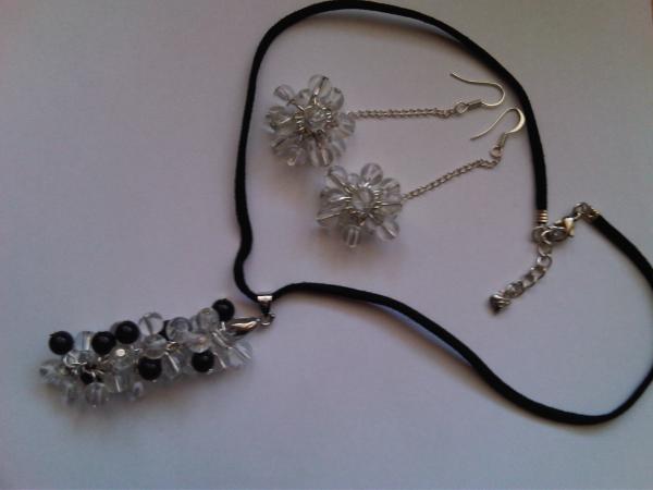 COD 514: set colier la baza gatului cu sfere transparente si negre pe snur negru, reglabil printr-un lantisor + o pereche de cercei lungi pe lantisor cu sfere transparente prinse cu za rotunda - pret 69 lei