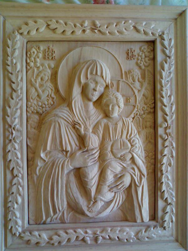 Prea Sfinta Nascatoare cu Dumnezeiescul Prunc in brate,strict in Canoanele Ortodoxe,unicata si autentica,fiind executata in peste 960 de ore(peste 5 luni),numai manual,nu electic sau copiator,rama este sculptata cu model simbolic,tot manual,cu frunze si fructe de stejar,lemnul de fag,este uscat natural de peste 5 ani,dimensiuni 35x45cm!Conservarea,lacuirea si nuantele se stabilesc ulterior,impreuna cu beneficiarul!Execut orice icoana(exclus copiere),dupa modelul clientului sau catalogul personal,in maxim 1 an,cu 40% avans!Si sculptura laica(busturi,mic mobilier stil rococco si baroc)!Nu primesc comenzi de restaurare sau Kitsch-uri!Rog,doar iubitorii si cunoscatorii de arta ce isi pemit acest lux,sa ma contacteze .