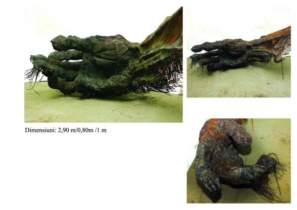 Lucrearea este realizata din sarma de fi 4 mm ponctata una langa cealalta pana formeaza imaginea unui element anatomic,(mana) avand dimensiunea de 3 m, identificat prin anprenta realizata din acelasi material