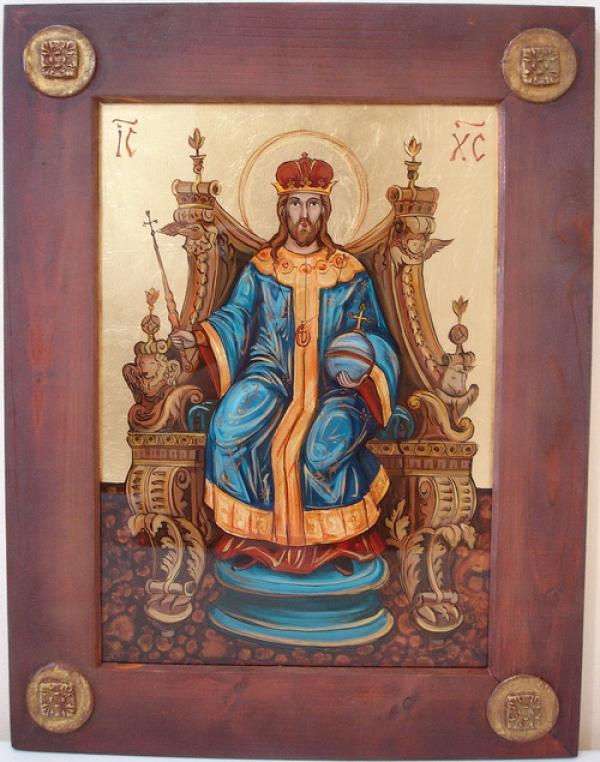 Icoana pictata in ulei pe sticla, cu foita de aur si rama de lemn cu peceti de lemn aplicate.