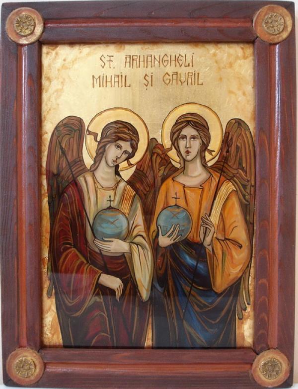 Icoana pictata in ulei pe sticla, cu foita de aur si rama de lemn cu peceti ceramice.