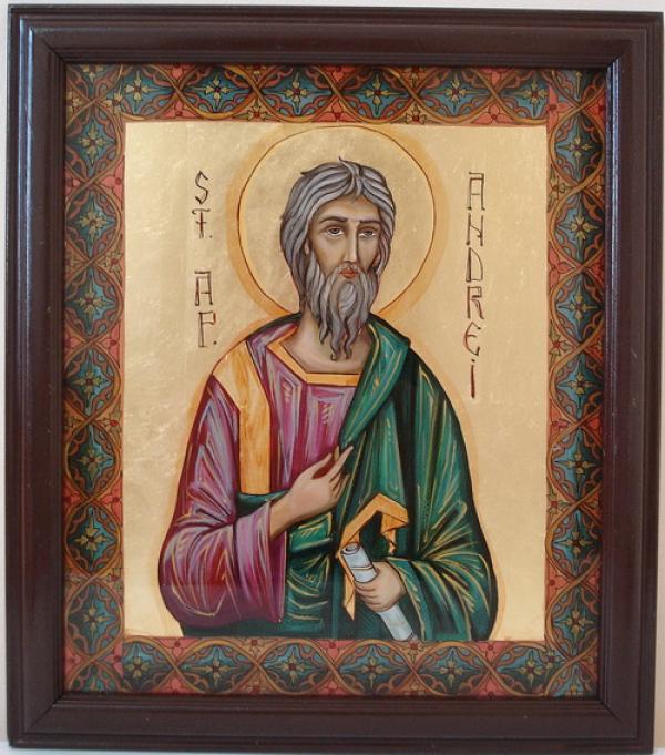 Icoana pictata in ulei pe sticla, cu foita de aur si rama din lemn.