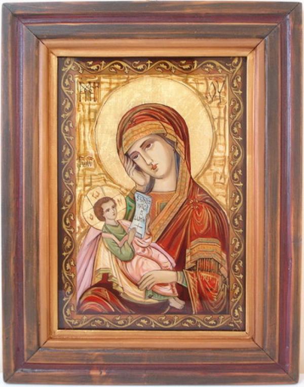 Icoana pictata in ulei pe sticla, cu foita de aur si rama din lemn.