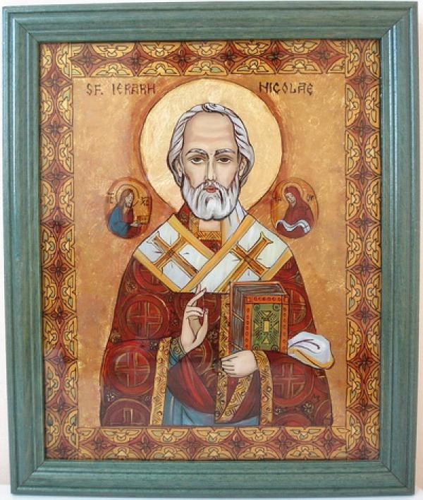 Icoana pictata in ulei pe sticla, cu foita de aur si rama din lemn.