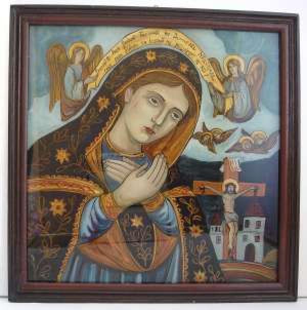 Icoana pictata in ulei pe sticla, inspirata din arta populara romaneasca a sec. IXX, cu foita de aur, cu rama de lemn.