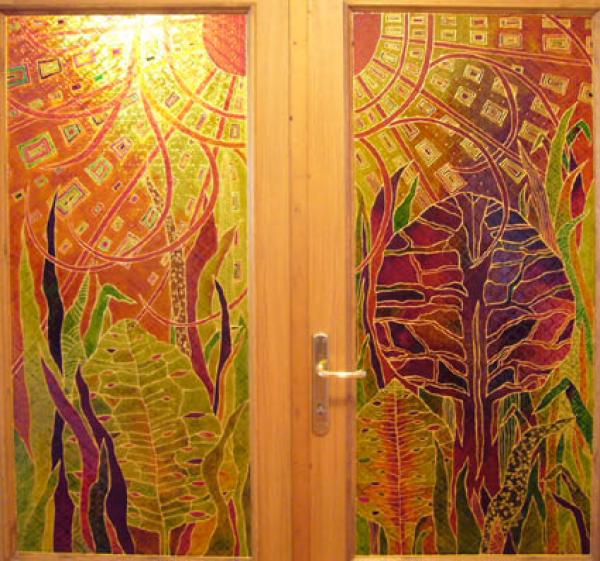 Geamurile usilor sau ferestrelor pot fi pictate la comanda.Culori speciale pentru pictura pe sticla,foarte rezistente in timp.