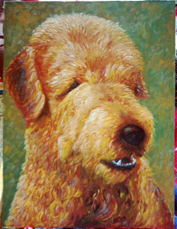 In lucrare este reprezentat cainele unor prieteni, un Airedale terier \"proaspat freza\"t.
