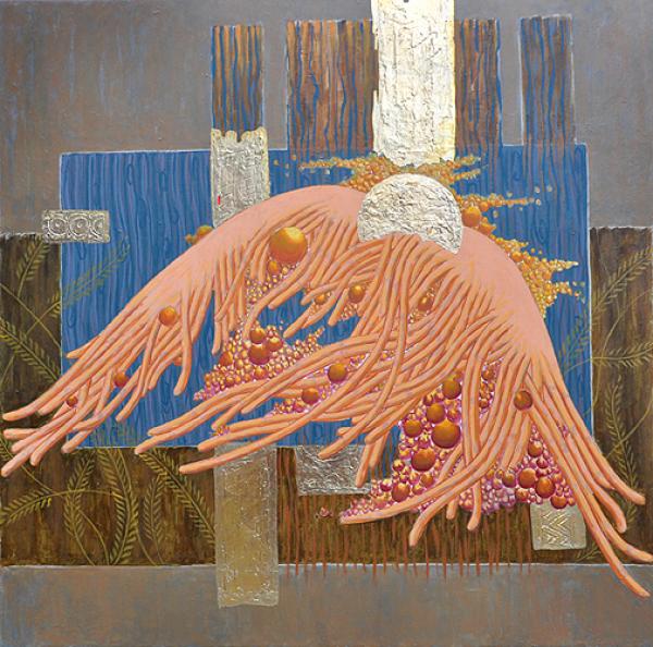 Dimensiuni: 80x80 cm. Tehnica: Acrilic pe panza, elemente poleite cu foita de aur.