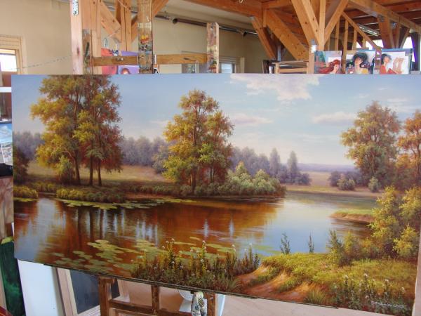 A beautiful landscape, inspired by a channel of the Danube, was not so good, I\\\'ve improved. We applied an interesting technique using a transparency background with trees and grass land overlaps. I photographed the easel with everything to see how big. Sure your taste and I like how it came out!