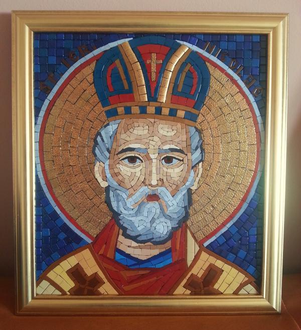 Lucrare realizata in tehnica mozaicului, din sticla colorata cu insertii aur 24k. Dimensiune 29 x 40 cm.Pret actual : 250 €