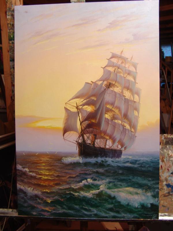 Un rasarit pe valuri,care aduce linistea sufleteasca si va umple de energie si vitalitate. Peisajul marin se potriveste in orice ambient, rama potrivita il transforma inr-un tablou modern sau o pictura clasica realista. Lucrarea este in stoc si-si asteapta locul potrivit in casa Dvs.