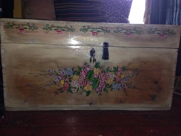 Lada de zestre cu o vechime de peste 100 ani , restaurata si reconditionata manual cu pictura acrilica, rasini de intretinere si marire rezistenta la umezeala,interior lacuit.