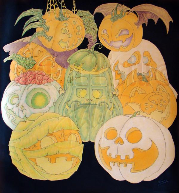 Lucrare executata in creioane color si acrilic. Dovleci reprezentant diverse costume de Halloween. Dimensiune lucrare 70x77 cm