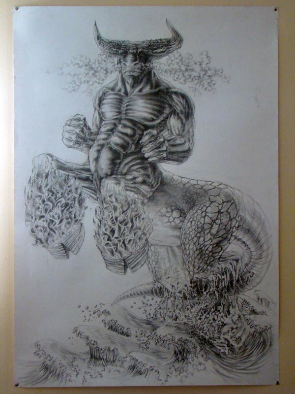 Lucrare reprezentad o creatura hibrid, formata din mai multe elemente: foc, apa, aer, pamant etc. precum si din diverse parti corporale ce difera de la o specie la alta.