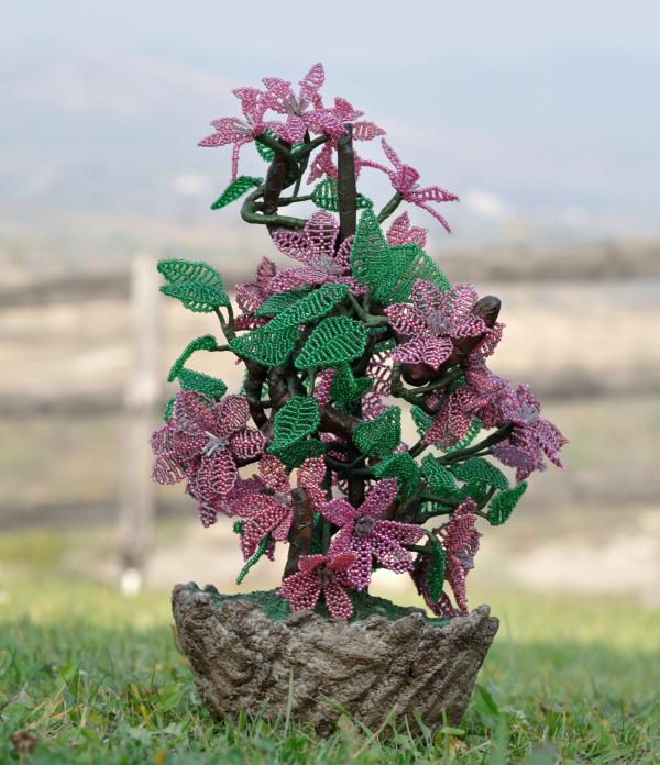 Floare de clematis realizata din margele de nisip de 2 mm ,fixate pe support metallic . Fixata in vas lucrat manual . Lacuit cu lac .Inaltime 35 cm ,latime 28 cm .