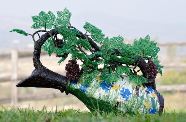 Vita de vie realizata din margele de nisip ,fixata in sticla decorata manual . Lacuita cu lac rezistent la apa . Inaltime 30 cm ,lungime 38 cm