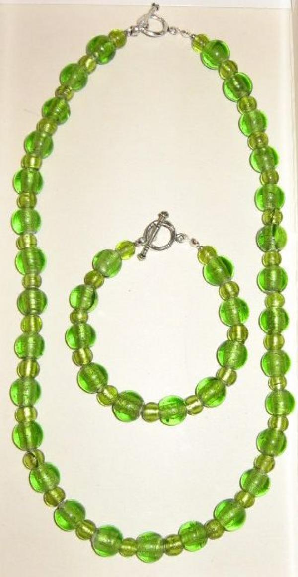 Set din margele din sticla de Muranob, cu diametre de 6 si 10 mm, cu foita de argint, stralucind sub transparente colorate. Colierul este scurt (40cm), usor sub baza gatului. Bratara are 18cm.