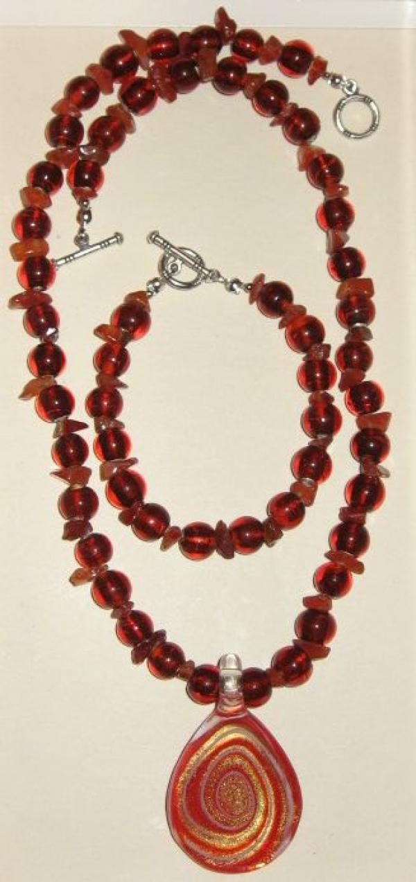Set din sticla de Murano si Carnneol, format din colier si bratara in culori superbe prin care straluceste foita de argint. Lungimea colierului este de aproximativ 40 cm, format din margele cu diametrul de aproximativ 10 mm, chipsuri de Carneol si pandantiv.