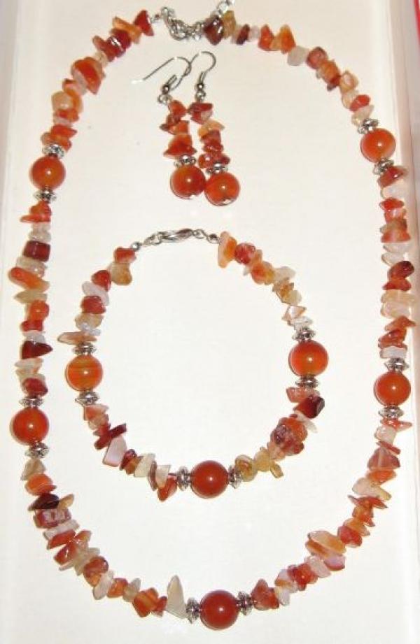 Set din chipsuri de carneol si margele din sardonix de 10 mm. Colierul este scurt (40cm), usor sub baza gatului. Bratara are 18cm.