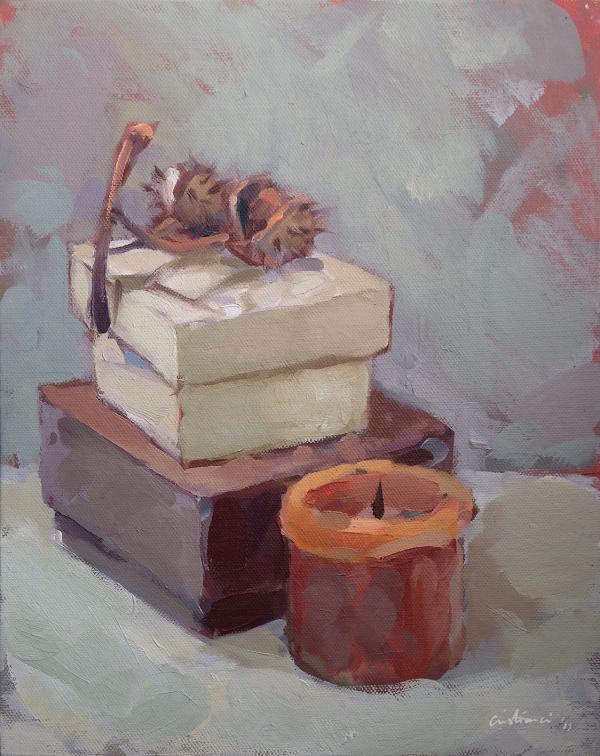 Natura statica cu obiecte. Ulei pe carton panzat. Dimensiuni: 24x30cm