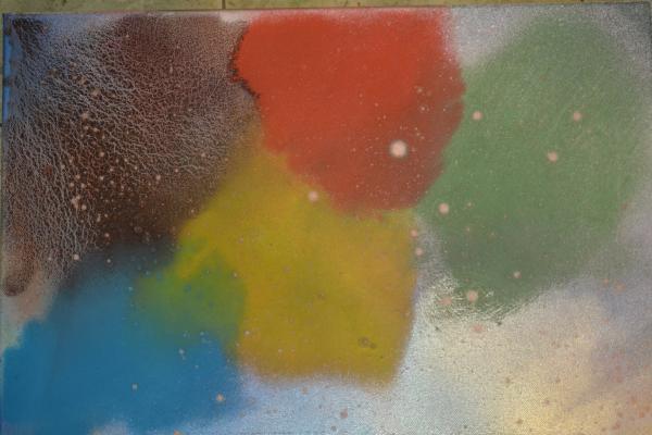 Tablou ulei. 40x60. Culori predominante: rosu, Galben, albastru, argintiu cu pete de cupru.